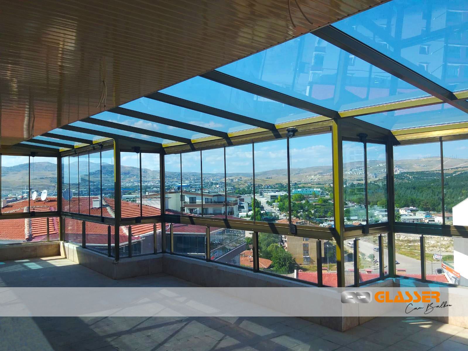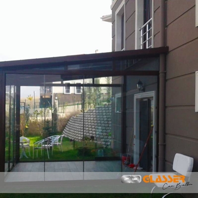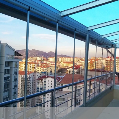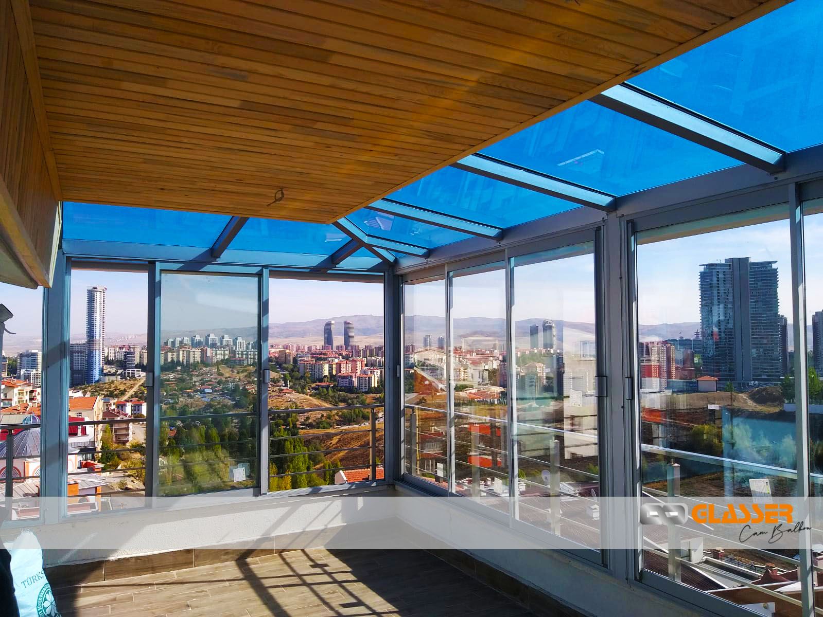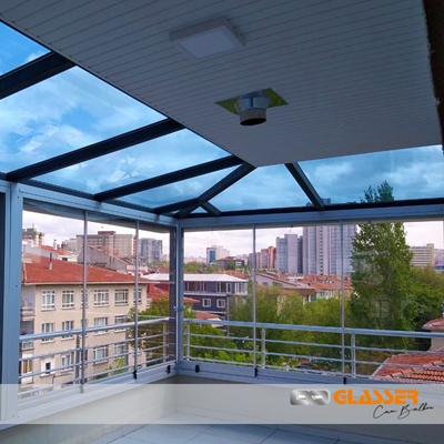 تطبيق غطاء الشرفات شبه الزجاجي هو مظهر عصري وأنيق، وهو تطبيق حديث لتغطية الشرفة له العديد من المزايا مثل الاستخدام المتوازن لأشعة الشمس والطاقة. التطبيقات المغلقة تقطع ضوء الشمس وتتسبب في بقاء الشرفة غير مضاءة، في حين أن جميع الأنظمة الزجاجية، على العكس من ذلك، يمكن أن تحافظ على المكان شديد الحرارة وتجعل استخدام منطقة التراس صعبا. في الأنظمة شبه الزجاجية، تم القضاء على هذه المشكلات، حيث أنها توفر استخداما مريحا للمساحة من خلال الحصول على إضاءة ودفء مثاليين في الصيف والشتاء. عند النظر إلى النظام من الخارج، فإنه يتمتع بمظهر أنيق وعصري غير مزعج بمظهره الذي يهيمن عليه الزجاج ولا يزعج الجيران. النظام مصنوع من الفولاذ ومقاوم للثلج والرياح. الزجاج تامبر وأزرق فاتح، ومجمع بأغطية محكمة الغلق من الألومنيوم. تعتبر هذه الانظمة صلبة ومقاومة للماء ومقاومة لأحمال الثلج والبرد والأمطار والعوامل الخارجية. تطبيق الشرفة مناسب لتركيب الزجاج المنزلق أو الشرفة الزجاجية أو الألومنيوم أو تطبيقات بي في سي حول الشرفة. يتم عمل أخدود انزلاق حول الشرفة ويتم عمل وصلات أنابيب تصريف المطر. يمكن تطبيق نافذة الخروج من السقف على النظام. يتم التطبيق بشكل اختياري على منطقة السقف بدون زجاج مع خيارات ألوان بي في سي أو الألواح الخشبية.